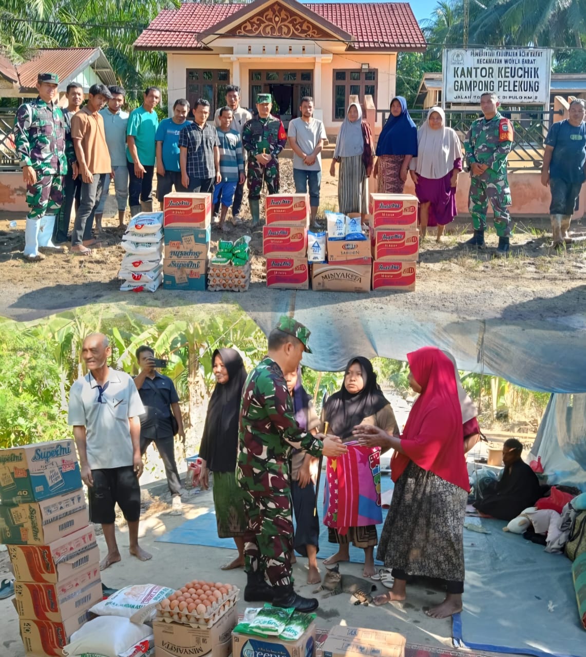 LCN – Aceh Barat – Tanggap bencana pasca banjir, Dandim 0105/Abar Letkol Inf S Kembaren,S.E.,M.I.P.,CFrA masif turun ke lokasi sekaligus memberikan paket Sembako kepada warga yang menjadi korban banjir dwilayah teritorial Koramil 10/Woyla Barat, Sabtu (29/11/2025)