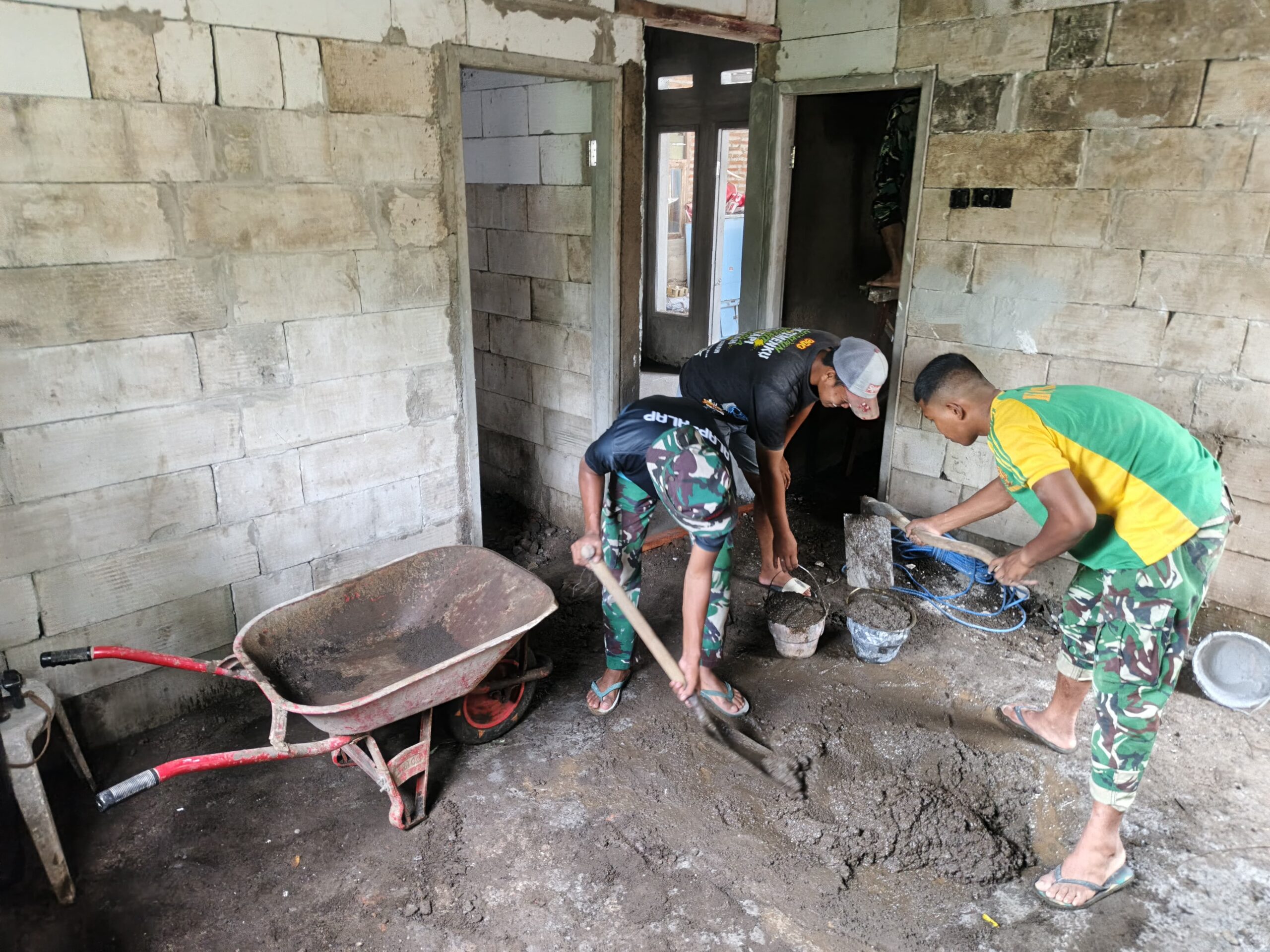 Prajurit dengan seragam kamuflase hijau-kuning khas TNI AD sedang membungkuk didepan gerobak dorong, sementara satu lagi mengayunkan cangkul untuk meratakan adukan semen dilantai. Dinding bata ekspos masih kasar, pintu kayu sederhana terbuka lebar, dan ember-ember berisi adukan berjejer disekitar mereka. Bau tanah basah dan semen segar memenuhi udara.