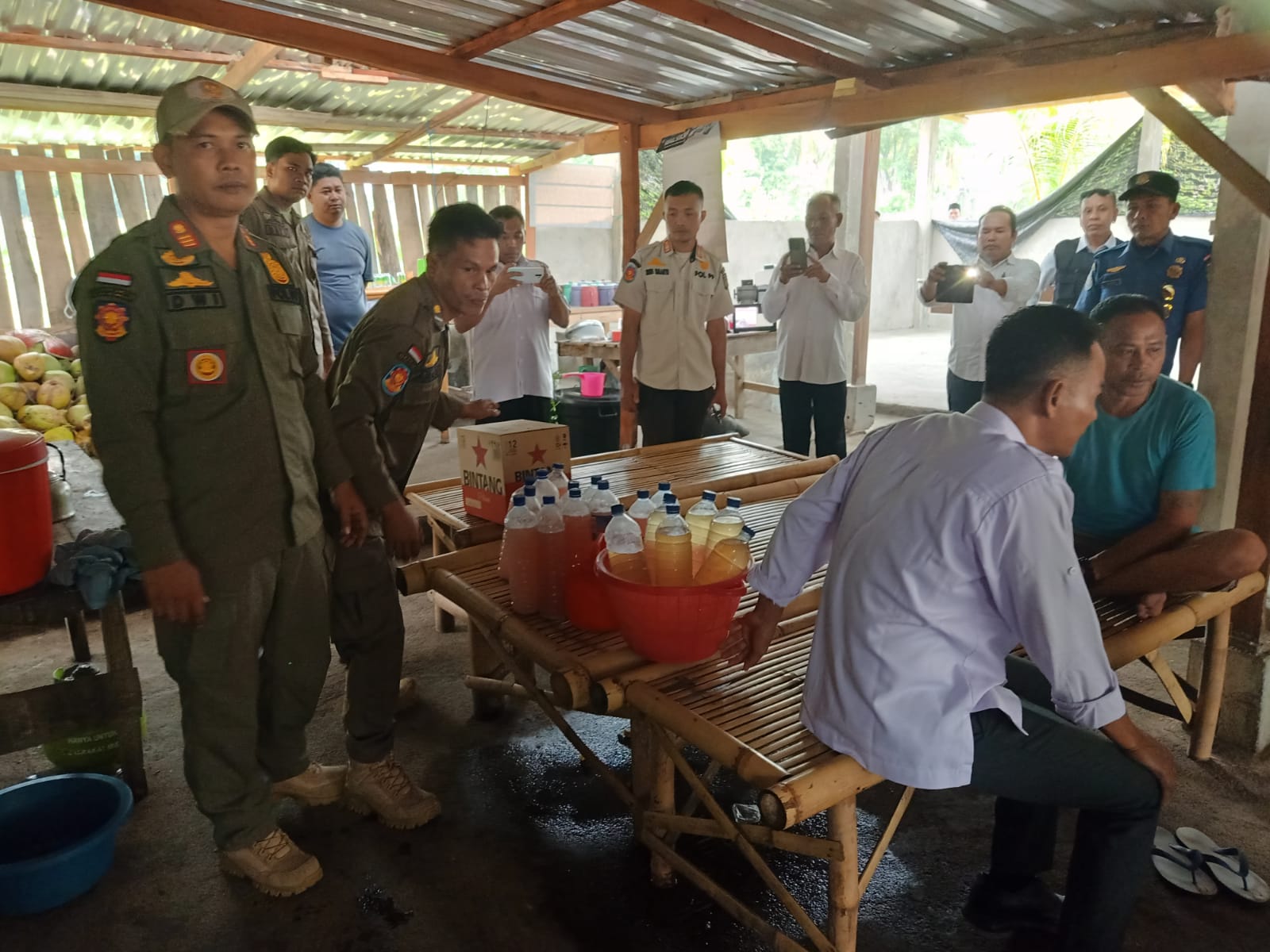 Hasil Penggeledahan Minuman Tradisional. Sejumlah miras lokal ditemukan tersembunyi, yakni minuman beralkohol, Berbagai botol miras bermerek turut disita sebagai barang bukti.