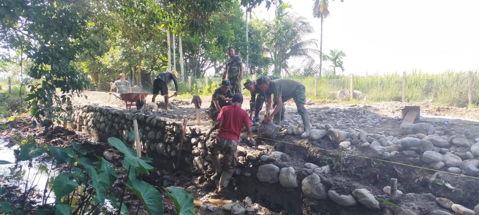 “Talut ini berfungsi sebagai penahan timbunan tanah disisi jalan agar tetap stabil dan tidak mudah tergerus, terutama saat turun hujan. Dengan memanfaatkan batu koral sungai, selain kuat juga lebih efisien karena materialnya tersedia disekitar lokasi, “ujar Dansatgas