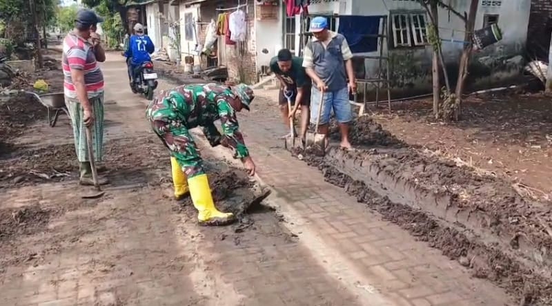 Dalam kegiatan tersebut, Babinsa bersama masyarakat bergotong royong membersihkan lingkungan dan jalan desa di sekitar pemukiman warga. Sampah, lumpur, serta kotoran yang terbawa arus banjir menjadi sasaran utama pembersihan agar tidak menimbulkan bau tidak sedap dan potensi penyakit. Kebersamaan antara Babinsa dan warga terlihat sangat kompak, mencerminkan semangat gotong royong yang masih kuat ditengah masyarakat.