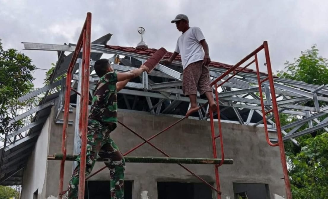 Satgas TMMD bersama masyarakat setempat tampak bekerja penuh semangat menyelesaikan pemasangan atap. Tahapan ini menjadi salah satu pekerjaan penting karena menandai pembangunan musholla telah memasuki fase akhir sebelum proses penyempurnaan.