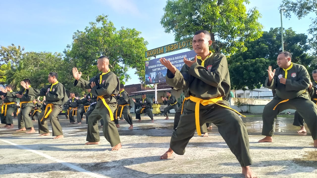 LCN – Lombok Tengah – NTB, Suasana dilapangan Makodim 1620/Lombok Tengah mendadak berubah riuh dengan deru napas yang teratur dan hentakan kaki yang mantap. Bukan sekadar apel pagi biasa, ratusan prajurit nampak lihai memainkan jurus-jurus tajam dalam sesi latihan Pencak Silat Militer (PSM).