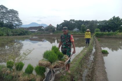 LCN – Blitar – Babinsa Kaweron Koramil 0808/16 Talun Serda Edi Prasetiyo bersama anggota Kelompok Tani (Poktan) Ngudi Bogo 1 melaksanakan kegiatan tanam padi dilahan milik, Siswanto yang b...