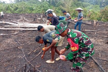 LCN – Mahakam Ulu – Babinsa Koramil 0912-03/Long Bagun melaksanakan kegiatan gotong royong bersama warga dalam penanaman padi gunung di Kampung Batumajang, Kecamatan Long Bagun, Kabupaten Mahaka...