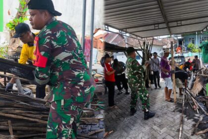 LCN – Pasuruan, – Wujud kepedulian terhadap warga yang tertimpa musibah, Babinsa Pandean, Koptu Riyanto, anggota Koramil 0819/12 Rembang, melaksanakan kegiatan Karya Bhakti pembersihan rum...