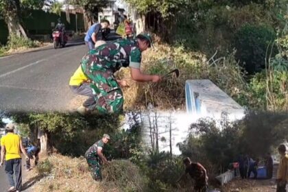 LCN – Pasuruan, – Babinsa Desa Tanjungarum, Serka Sudarno, anggota Koramil 0819/23 Sukorejo, bersama warga melaksanakan kerja bhakti pembersihan jalan di Dusun Krajan, Desa Tanjungarum, Ke...