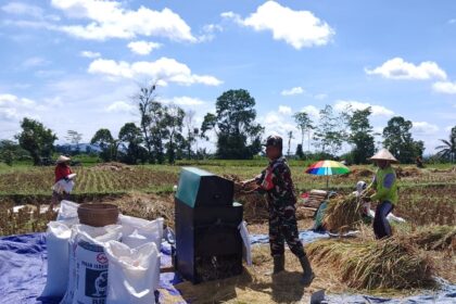 LCN – Blitar – Babinsa Desa Slumbung Koramil 0808/15 Gandusari Kopda Nurul Huda aktif mendampingi dan membantu petani dalam kegiatan panen padi sebagai wujud dukungan terhadap program swas...