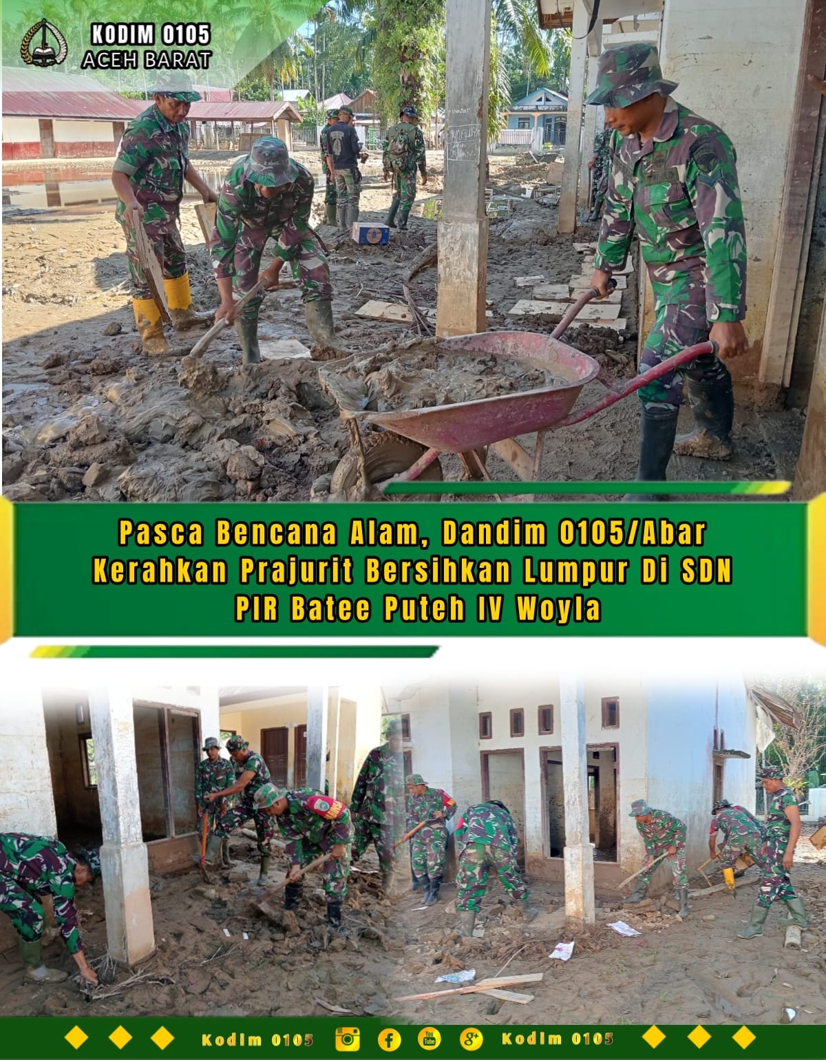 LCN – Aceh Barat – Setelah wilayah Aceh Barat dilanda bencana alam beberapa waktu lalu, Komandan Kodim 0105/Aceh Barat Letkol Inf S Kembaren,S.E.,M.I.P.,CFrA. langsung mengambil langkah cepat dengan menginstruksikan seluruh jajaran Prajurit untuk melaksanakan pembersihan fasilitas umum. Layaknya hari ini menggelar aksi kemanusiaan membersihkan lumpur di SDN PIR Batee Puteh IV Desa Pasi Birah Kecamatan Woyla Induk, Minggu (11/1/2026).