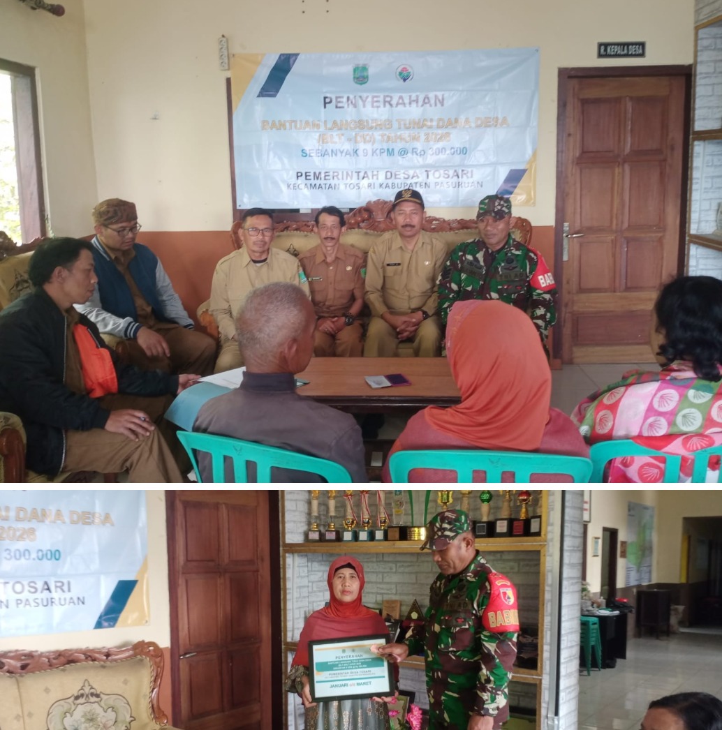 LCN – Pasuruan, Bertempat di Kantor Desa Desa Tosari, Kecamatan Tosari, Kabupaten Pasuruan, Serka Yulianto selaku Babinsa Koramil 0819/26 Tosari melaksanakan pendampingan kegiatan penyaluran Bantuan Langsung Tunai Dana Desa (BLT DD) Semester I Tahun 2026 kepada warga. Kegiatan ini merupakan bagian dari upaya pemerintah dalam membantu masyarakat yang membutuhkan serta memastikan penyaluran bantuan berjalan dengan tertib dan tepat sasaran. Senin (20/04/2026).