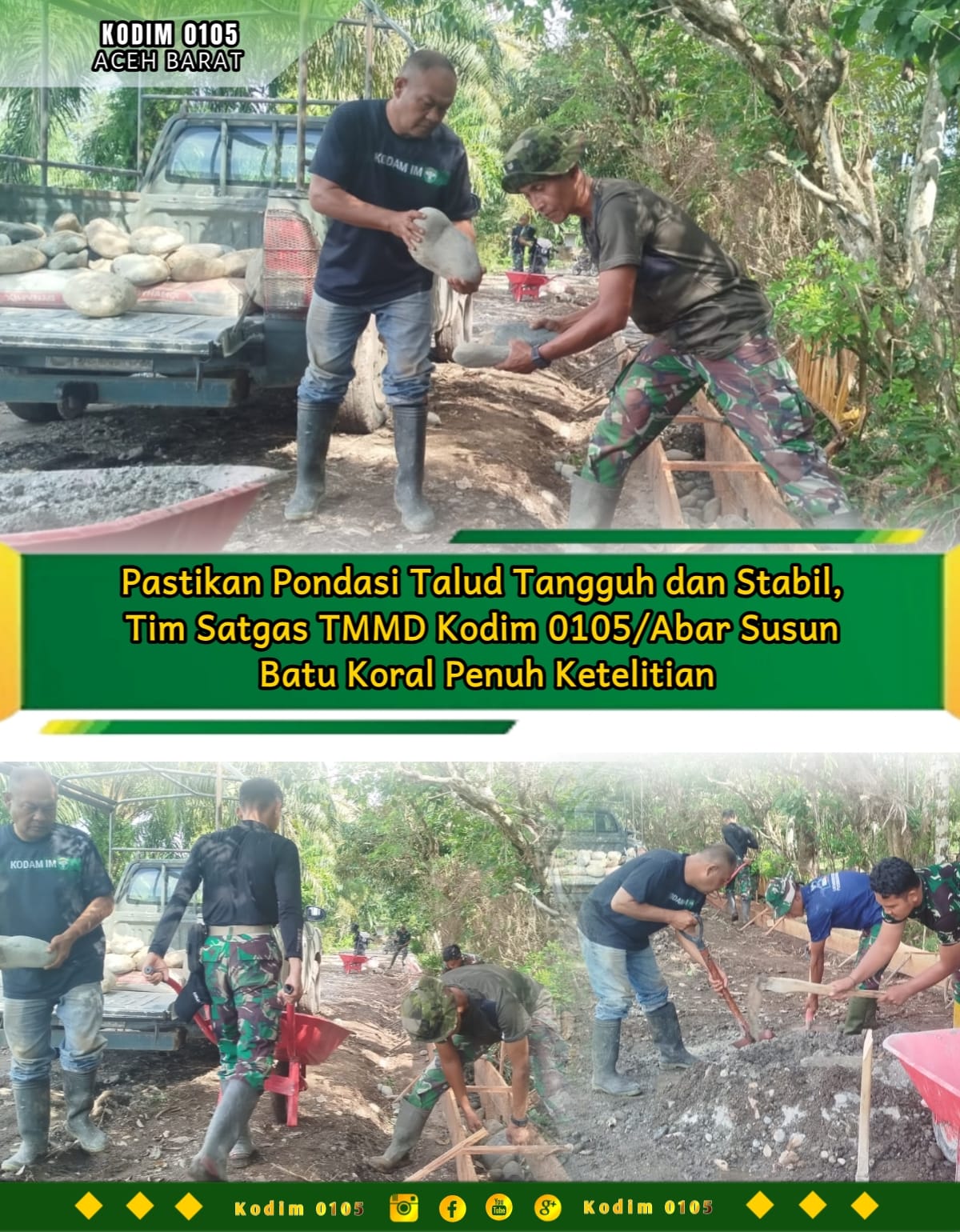 Pastikan Pondasi Talud Tangguh dan Stabil, Tim Satgas TMMD Kodim 0105/Abar Susun Batu Koral Penuh Ketelitian
