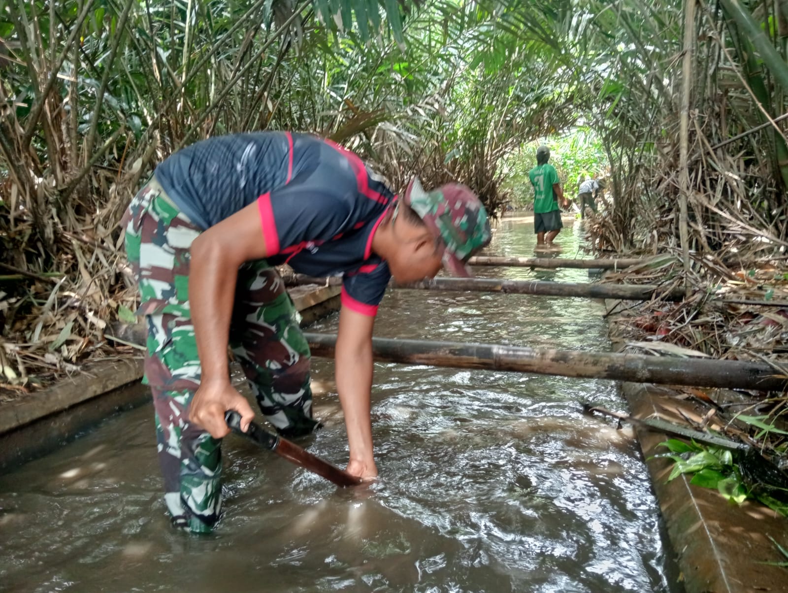 Normalisasi sungai difokuskan pada pembersihan sampah serta pengangkatan lumpur yang mengendap di sepanjang aliran sungai. Personel Satgas TMMD bersama warga setempat tampak bergotong royong membersihkan material yang menghambat aliran air agar kembali lancar.