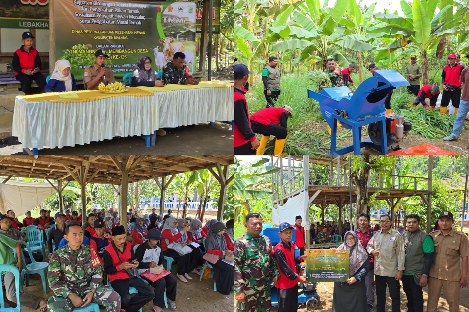 LCN – Malang, – Program TNI Manunggal Membangun Desa (TMMD) ke-126 yang dilaksanakan oleh Kodim 0818/Malang–Batu terus menunjukkan kontribusi nyata bagi masyarakat, tidak hanya dalam pembangunan infrastruktur, tetapi juga dalam pemberdayaan ekonomi. Salah satu kegiatan unggulan dalam program ini adalah pelatihan pembuatan pakan ternak melalui fermentasi yang digelar oleh Dinas Peternakan Kabupaten Malang, bertempat di Dusun Krajan II, Desa Lebakharjo, Kecamatan Ampelgading, Kabupaten Malang, Rabu (14/10/2025).