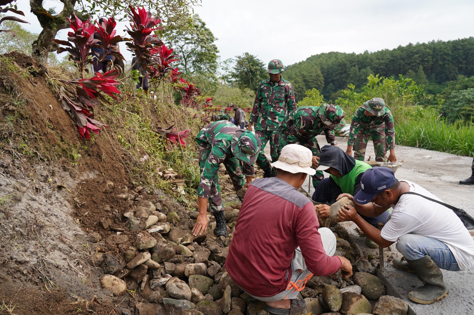 Anggota Satgas TMMD Ke 127 Kodim 0808/Blitar bersama warga melaksanakan gotong royong untuk pemasangan berem jalan sebagai bagian dari tahapan penyempurnaan pembangunan infrastruktur jalan yang menghubungkan Dusun krisik dan Dusun wonorejo Desa Krisik Kecamatan Gandusari Kabupaten Blitar
