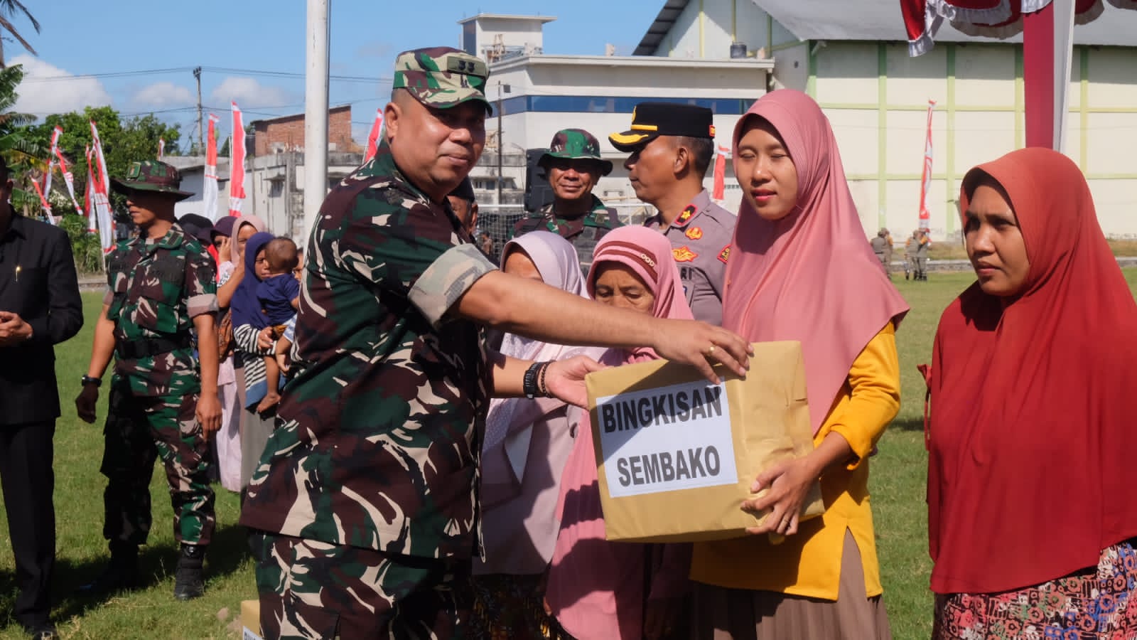 Pembukaan TMMD ditandai dengan pemukulan gong oleh Inspektur Upacara, dilanjutkan dengan pemberian bantuan stunting dan sembako kepada masyarakat serta peninjauan lokasi sasaran TMMD.