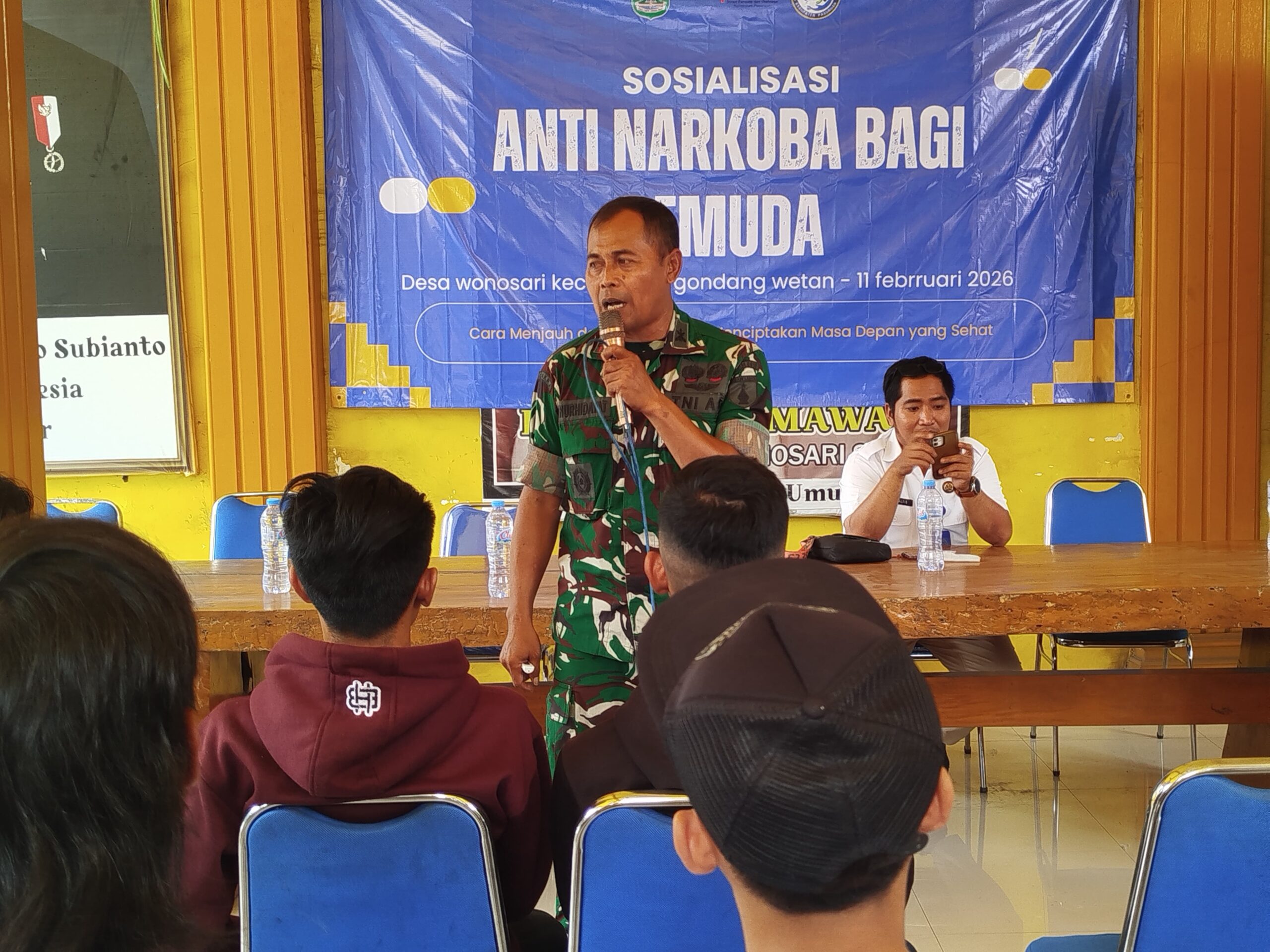 LCN – Pasuruan, Kegiatan non fisik TNI Manunggal Membangun Desa (TMMD) ke-127 Kodim 0819/Pasuruan, Satgas TMMD menggelar Sosialisasi Pemuda Anti Narkoba yang berlangsung di Pendopo Balai Desa Wonosari, Kecamatan Gondang wetan, Kabupaten Pasuruan, Kamis (12/02/2026).