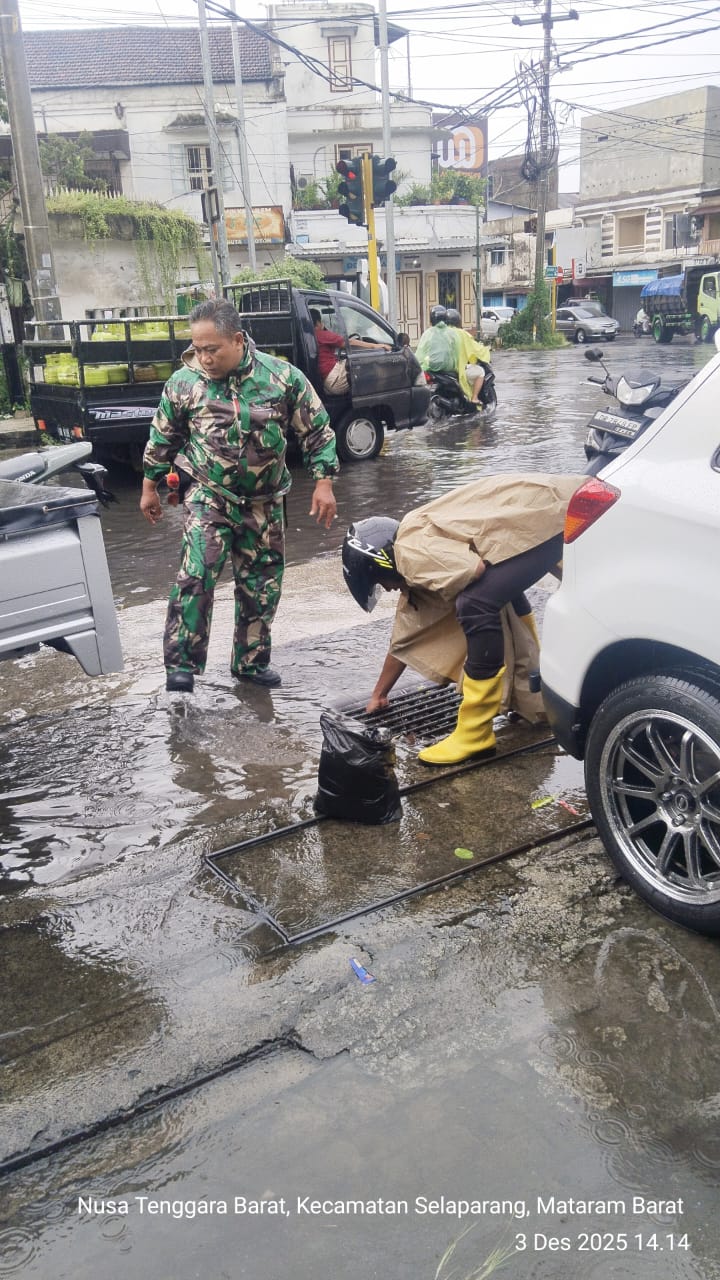 Bintara Pembina Desa (Babinsa) Ampenan Tengah Komando Rayon Militer (Koramil) 1606-09/Ampenan, Serka Agus Subiantoro, bersama Lurah Ampenan Tengah Budiawan S.Pd., S.H., L.NP, turun langsung melakukan monitoring di sejumlah lokasi terdampak. Beberapa titik yang terpantau mengalami genangan cukup tinggi meliputi Lingkungan Sukaraja Perluasan, Lingkungan Tempit, Lingkungan Presak, Jalan Koperasi depan Pegadaian, serta Jalan Yayasan Al Hidayah yang berbatasan dengan Kelurahan Pejeruk.