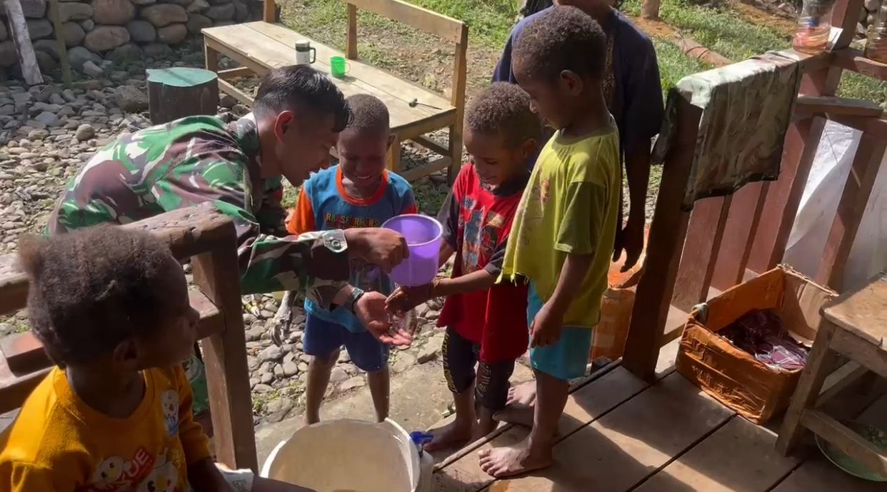 LCN – Kampung Bringin, – Papua Pegununga, Pos Selal melaksanakan pembinaan teritorial bertema hidup bersih dan sehat bagi anak-anak Kampung Bringin. Kegiatan ini dilakukan oleh salah satu anggota Pos Selal Kopda Galuh dengan pendekatan praktik langsung, mulai dari cara memotong kuku yang benar, membiasakan cuci tangan pakai sabun sebelum makan dan setelah beraktivitas, hingga ajakan makan bersama untuk memenuhi kebutuhan gizi seimbang Senin, (06/10/2025).