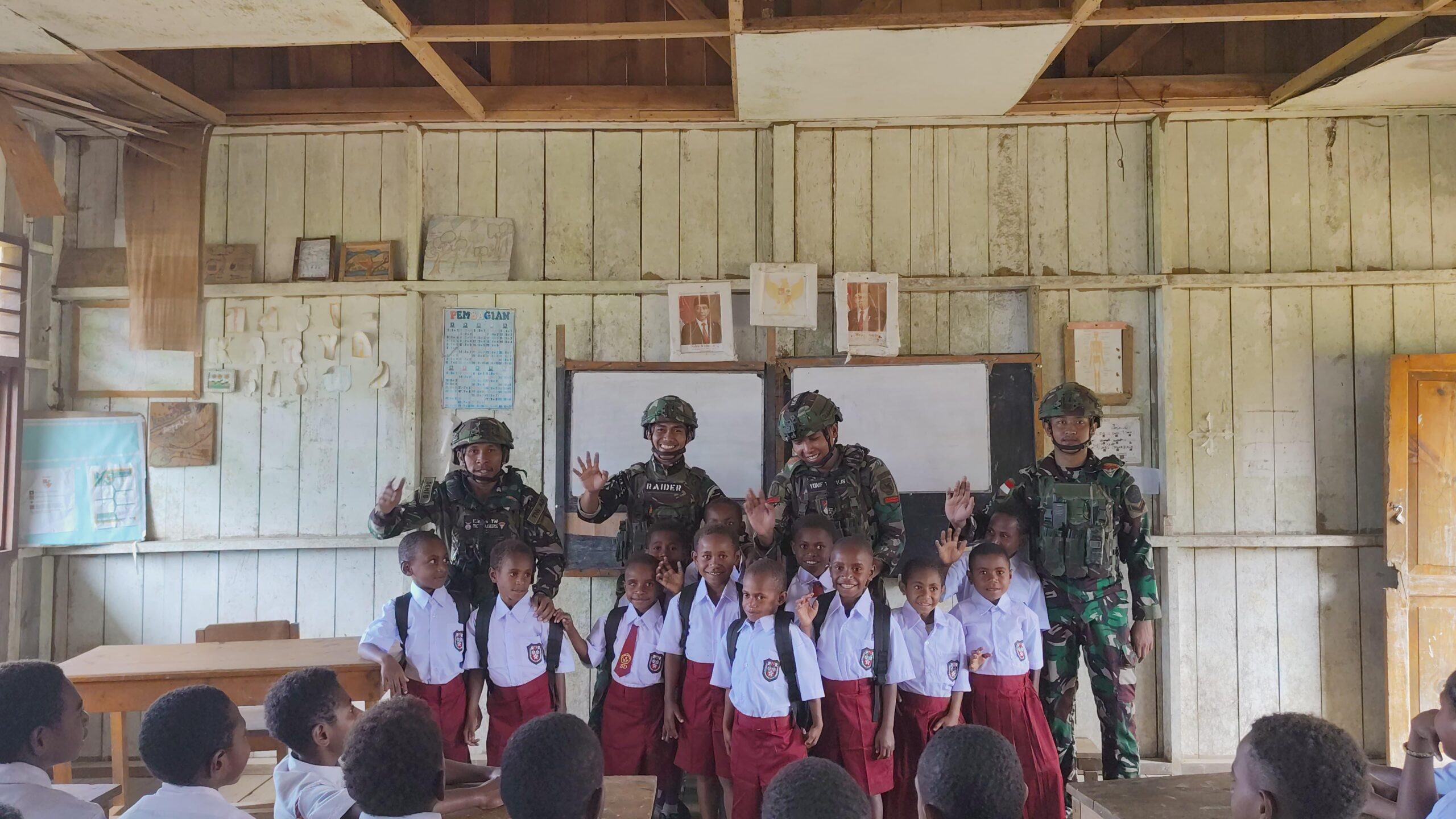 LCN – Tarup, – Pegunungan Bintang, Pos Tarup Satgas Pamtas RI–PNG Yonif 751/Vira Jaya Sakti (VJS) melaksanakan kegiatan pembinaan teritorial (Binter) dengan mengajar wawasan kebangsaan kepada siswa-siswi SD Tarup, sekaligus membagikan seragam dan perlengkapan sekolah. Kegiatan ini dipimpin langsung Danpos Tarup, Letda Inf Elpidius, sebagai wujud kepedulian TNI dalam mendukung pendidikan dan pembentukan karakter generasi muda diwilayah perbatasan. Senin, (09/02/2026).