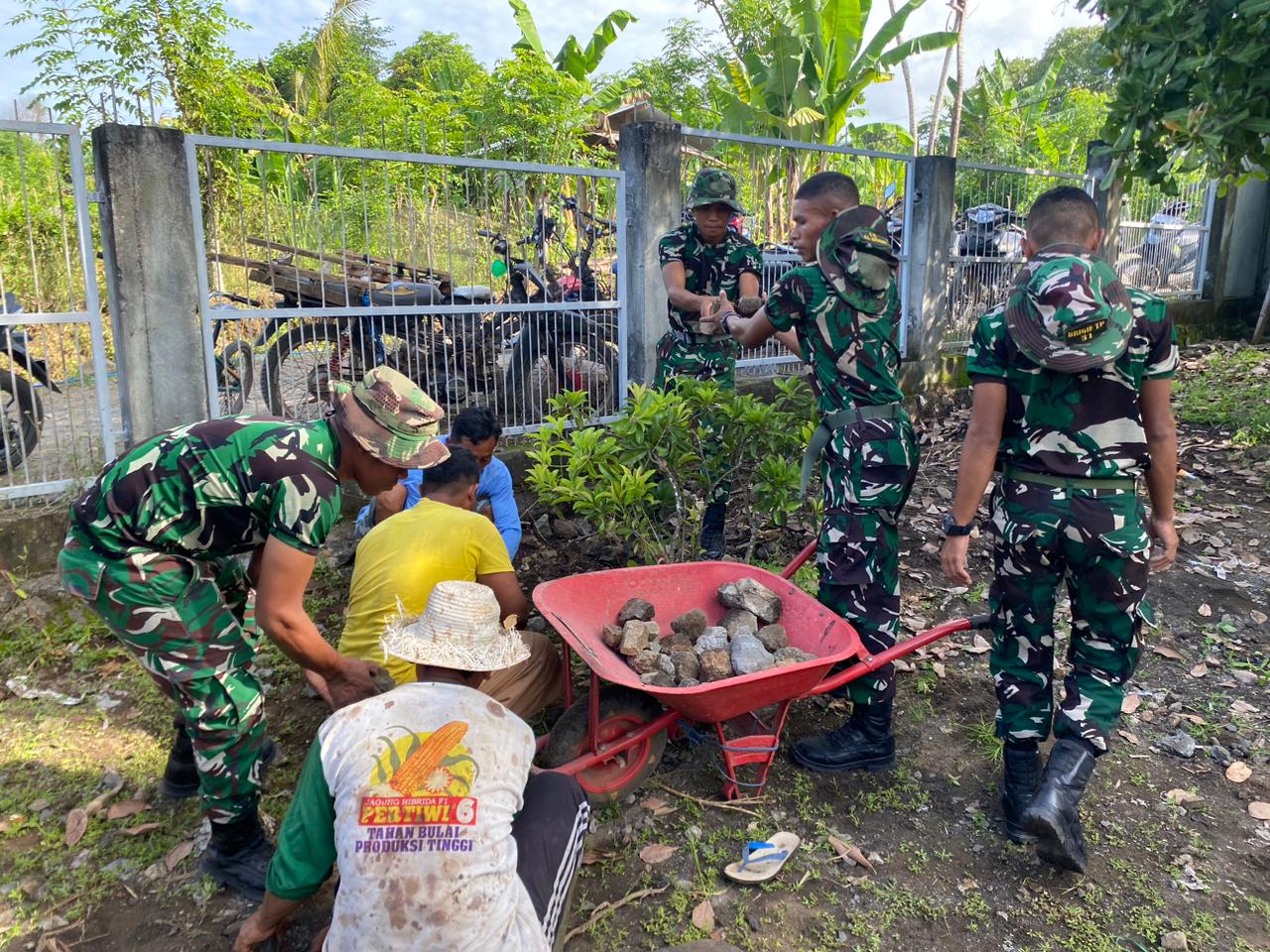 Sejak pagi, prajurit bersama masyarakat bahu-membahu mengangkut material, melakukan pengecoran, pemasangan batu, serta pembersihan area sekitar masjid.