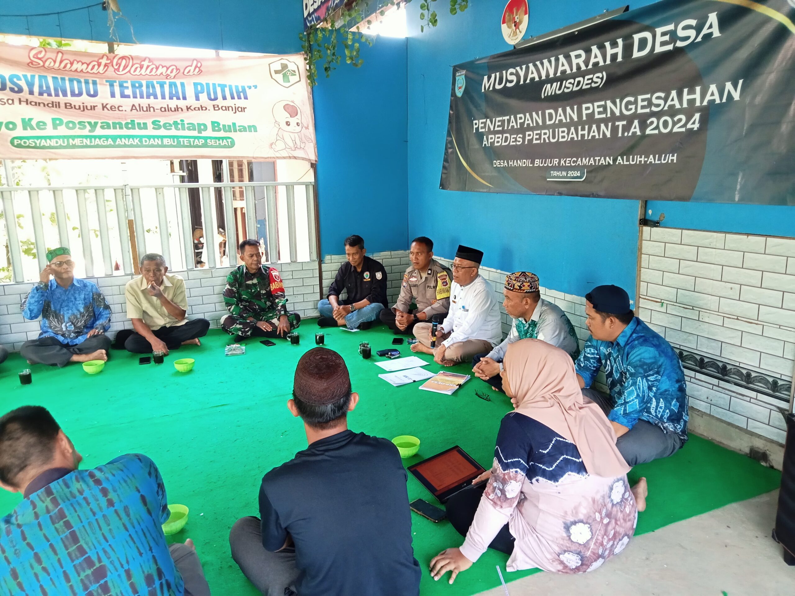 TimCyber— MARTAPURA – Musyawarah desa dalam rangka Penetapan Dan Pengesahan APBDes Perubahan T.A.2024 turut dihadiri Babinsa Koramil 1006-11/Alh Sertu Sofyan yang berlangsung di aula Papadaan Desa Handil Bujur Kecamatan Aluh – Aluh Kabupaten Banjar . Minggu ( 27/10/2024)
