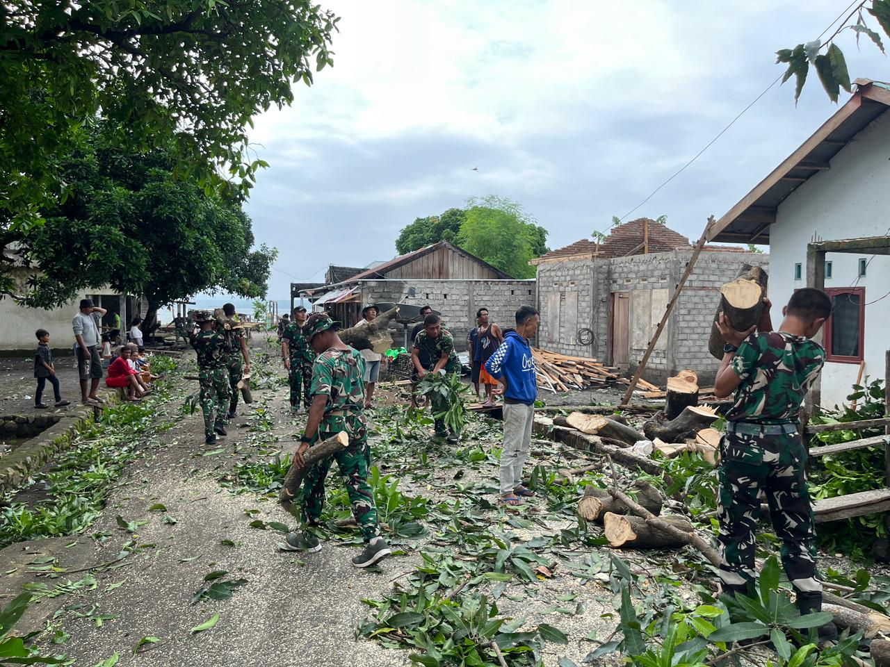 Masyarakat sekitar turut membantu proses pembersihan, menunjukkan tingginya solidaritas antara TNI dan warga dalam mengatasi dampak bencana.