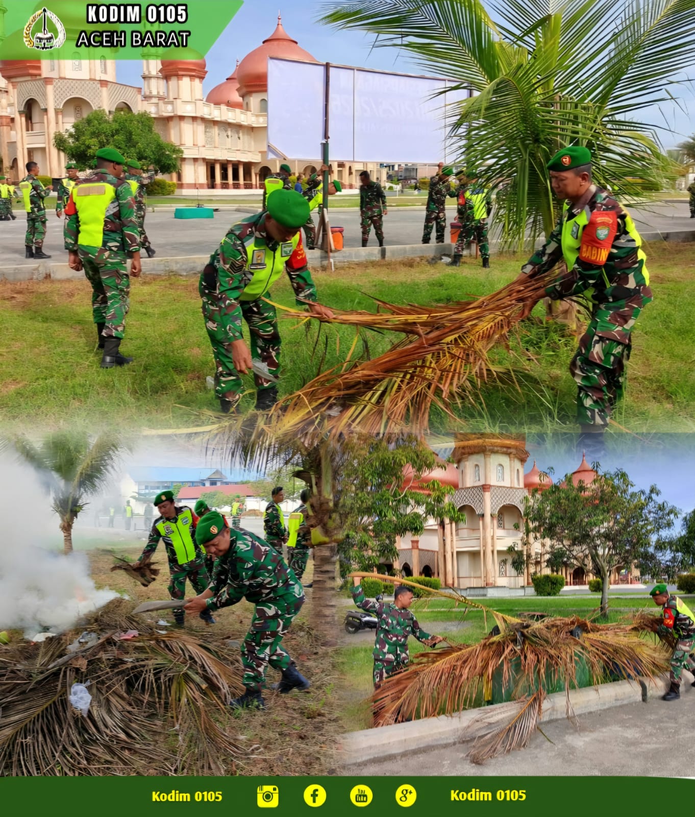 LCN – Aceh Barat – Dalam rangka menyambut datangnya Tahun Baru 2026 Masehi, Prajurit Kodim 0105/Abar menggelar aksi sosial Gotong Royong membersihkan lingkungan Masjid Agung Baitul Makmur Jalan Imam Bonjol Desa Seuneubok Kecamatan Johan Pahlawan, Selasa (30/12/2025)