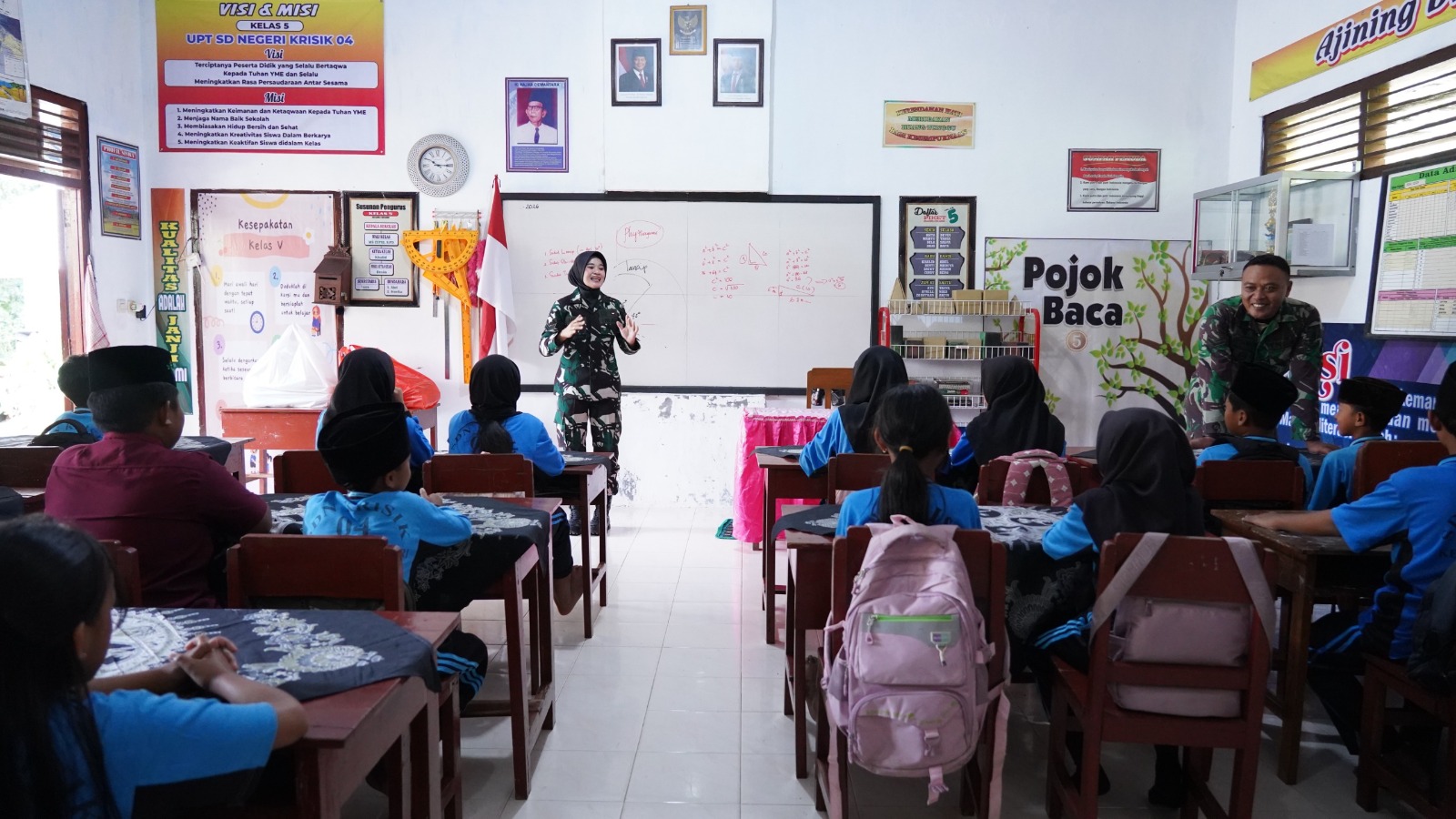 Sertu (K) Mira salah satu personel Satgas TMMD ke 127 Kodim 0808/Blitar, terlihat mengambil peran sebagai guru dengan berinteraksi langsung dengan para pelajar diruang kelas UPT SD Negeri 4 Krisik, Selasa (24/02/2026)