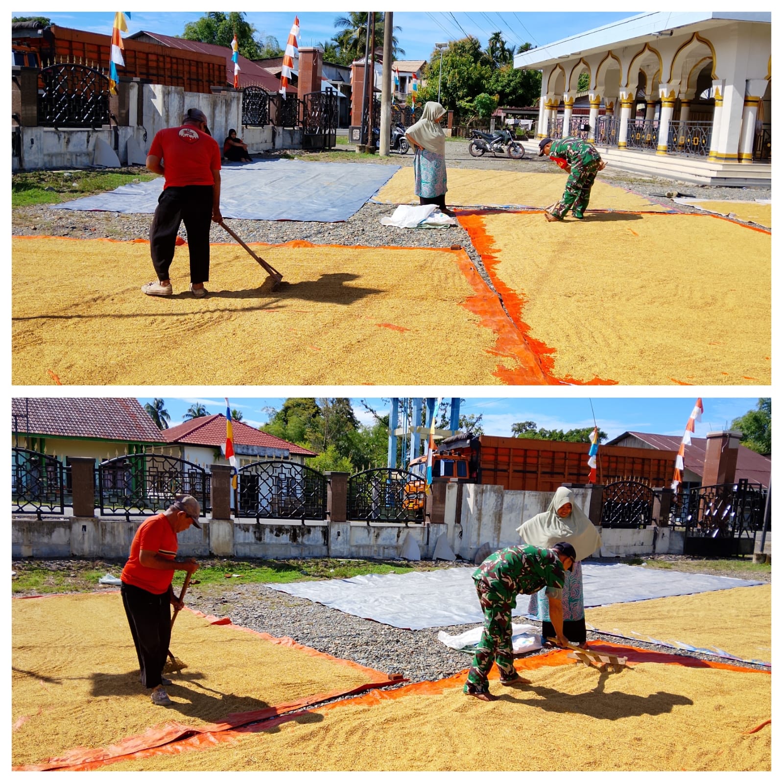 Dalam kegiatan tersebut sertu Pendi turun langsung ke desa untuk membantu proses penjemuran padi.ia tampak berbaur dengan warga mengangkat menyebarkan hingga meratakan padi agar cepat kering di bawah sinar matahari.