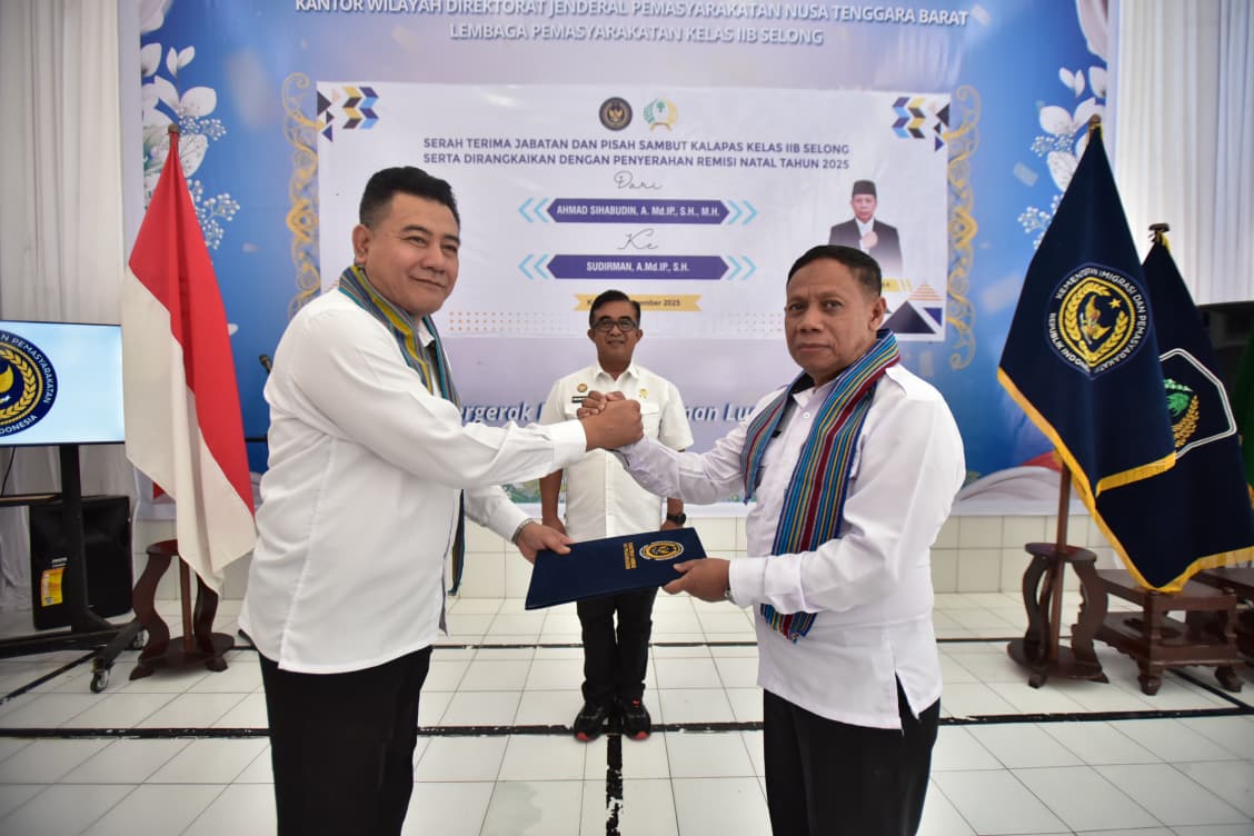 LCN – Lombok Timur, – NTB, Lapas Kelas IIB Selong menggelar acara pisah sambut dan serah terima jabatan Kepala Lapas, Kamis pagi, 25 Desember 2025, bertempat di Aula Lapas. Acara ini menjadi momen penting dalam transisi kepemimpinan dari Ahmad Sihabudin kepada Sudirman, yang sebelumnya telah dilantik oleh Kepala Kantor Wilayah Direktorat Jenderal Pemasyarakatan NTB.