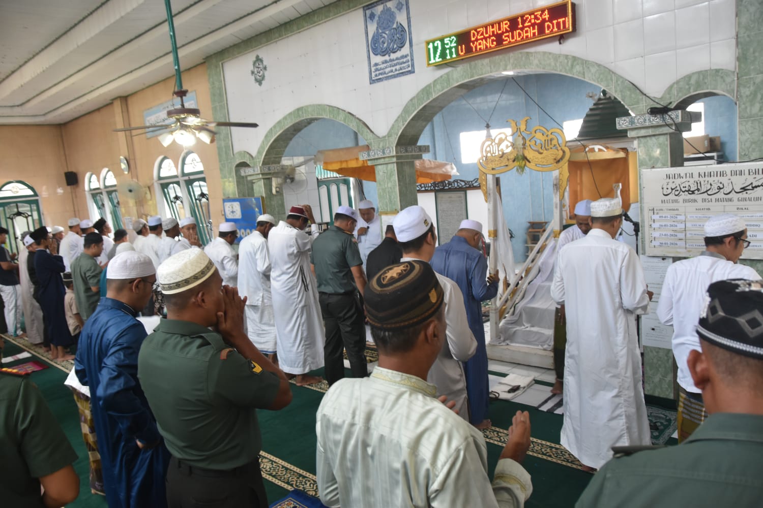 LCN – Hulu Sungai Tengah – Komandan Kodim 1002/Hulu Sungai Tengah, Letkol Inf Ardiansyah Okta Putra Siregar, bersama anggota Kodim 1002/HST melaksanakan Sholat Jum’at berjamaah di Masjid Nurul Muhtadin, Desa Matang Birik, Kecamatan Pandawan, Kabupaten Hulu Sungai Tengah, Jum’at (30/01/2026).
