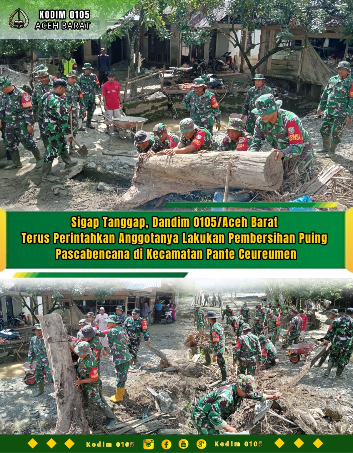 Home / Berita TNI / Sigap Tanggap, Dandim 0105/Aceh Barat Terus Perintahkan Anggotanya Lakukan Pembersihan Puing Pascabencana di Kecamatan Pante Ceureumen