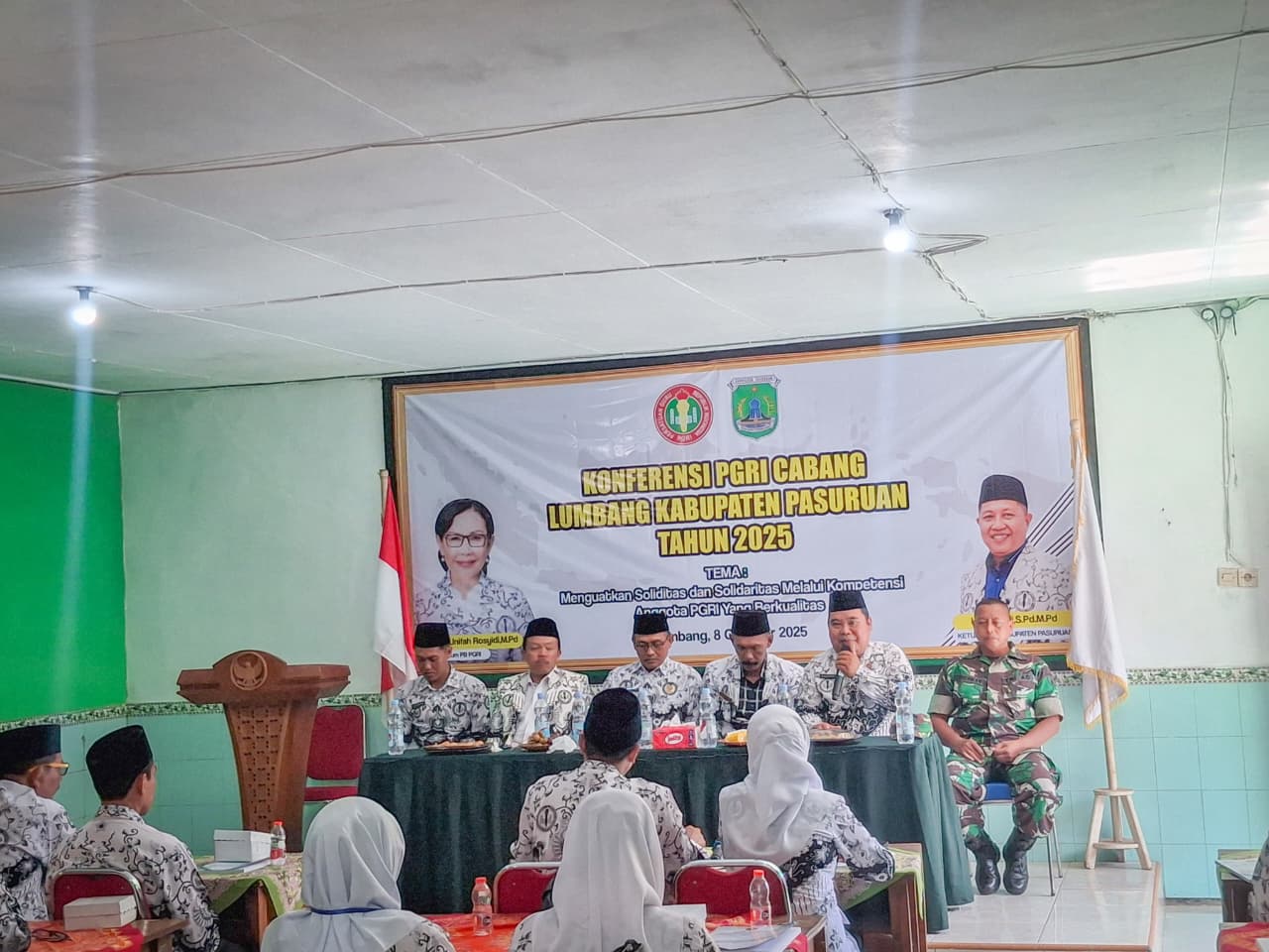 LCN – Pasuruan, Dalam upaya memperkuat sinergi antara dunia pendidikan dan aparat kewilayahan, Peltu Suherman, selaku Bati Tuud Koramil 0819/09 Lumbang, menghadiri Konferensi Cabang PGRI Kecamatan Lumbang yang digelar di Aula Korwil Bidang Pendidikan Kecamatan Lumbang, Kabupaten Pasuruan, Rabu (08/10/2025). Kegiatan ini dihadiri oleh Camat Lumbang Didik Suriyanto, S.Pd., M.MPd, serta Basori, S.Pd., M.MPd selaku Wakil 2 PGRI Cabang Pasuruan.