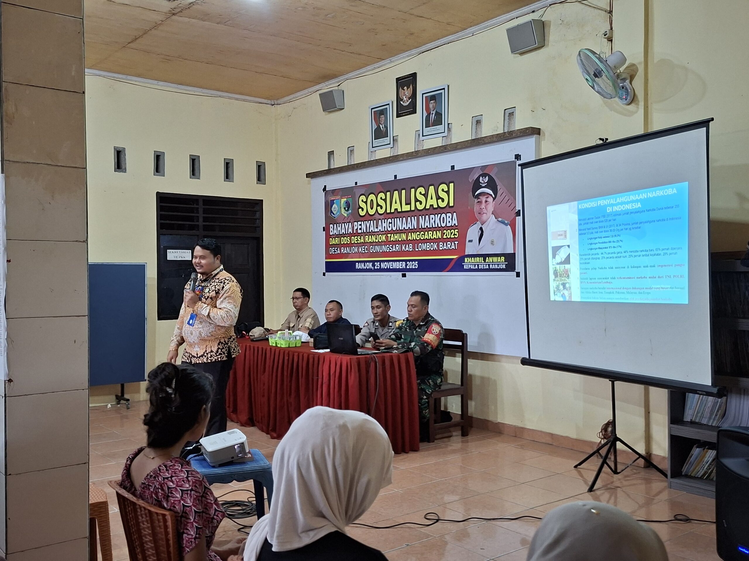 LCN – Lombok Barat – NTB, Upaya pencegahan penyalahgunaan narkoba kembali ditegaskan melalui kegiatan sosialisasi dan penyuluhan yang digelar di Aula Kantor Desa Ranjok, Kecamatan Gunungsari, Lombok Barat. Kegiatan tersebut dihadiri para perangkat desa, pemuda, tokoh lingkungan, hingga masyarakat sebagai bentuk komitmen bersama menjaga Desa Ranjok dari ancaman narkotika, Selasa sore (25/11/2025).