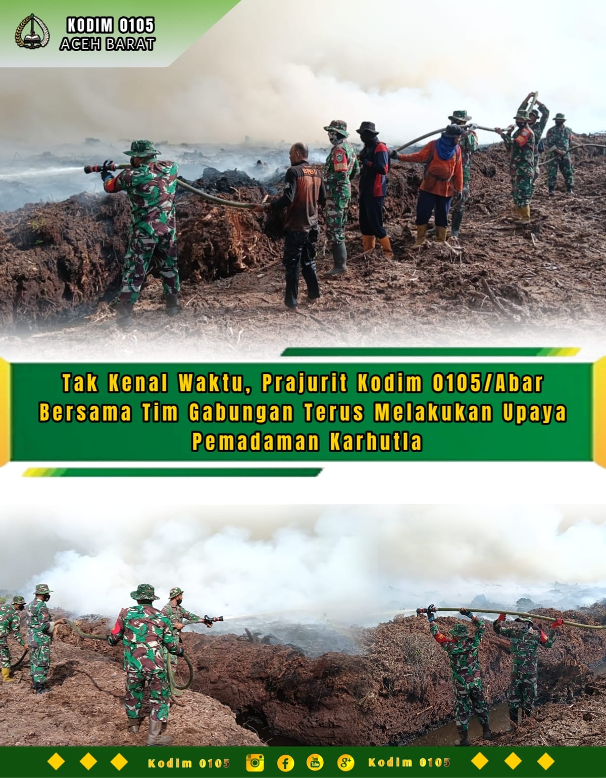 Tim Gabungan yang terdiri dari Prajurit Kodim 0105/Abar, BPBD Aceh Barat dan Masyarakat Peduli Api Desa setempat terus melakukan upaya pemadaman. Tanpa mengenal waktu dan tanpa mengenal lelah, mereka terus berjibaku untuk memadamkan kobaran api yang masih menyala serta dikepung asap tebal pekat menyengat.