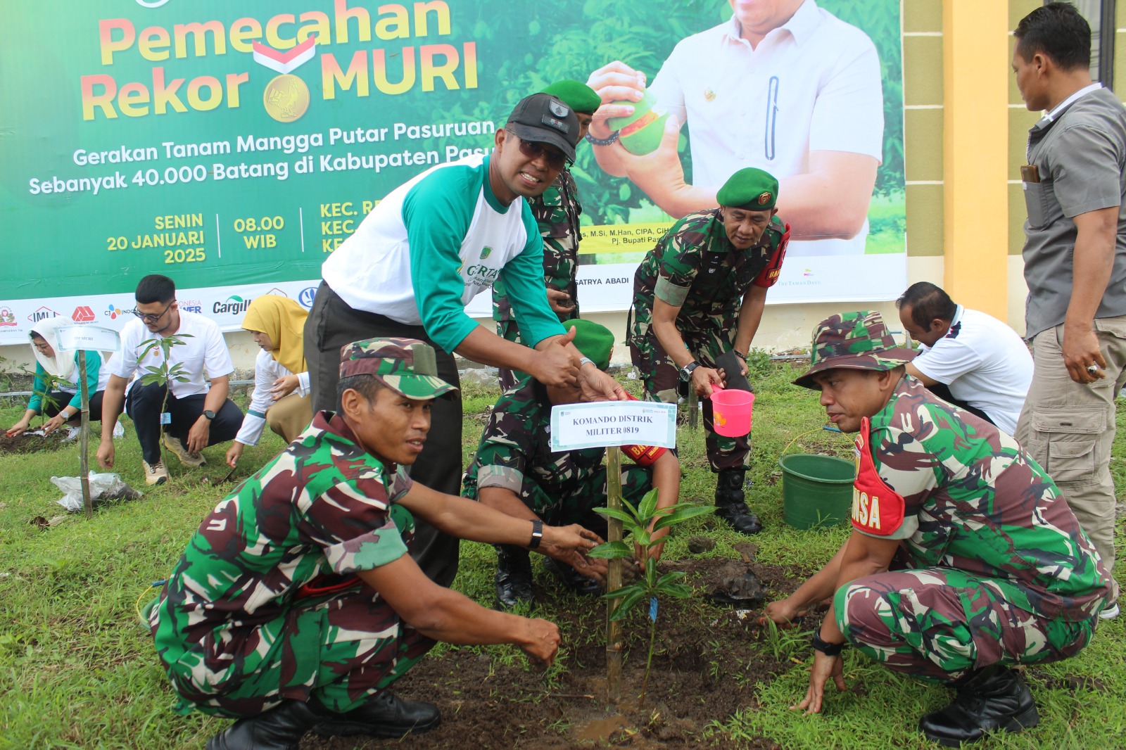 LCN – Pasuruan – Komandan Kodim (Dandim) 0819/Pasuruan Letkol Arh Noor Iskak S. T bersama jajaran Forkopimda Kabupaten Pasuruan ikut ambil bagian dalam gerakan tanam 40.000 bibit pohon mangga putar di wilayah Kab. Pasuruan. Bibit Mangga Putar tersebut ditanam ditiga lokasi tepatnya di Kecamatan Rembang, Wonorejo, dan Sukorejo.