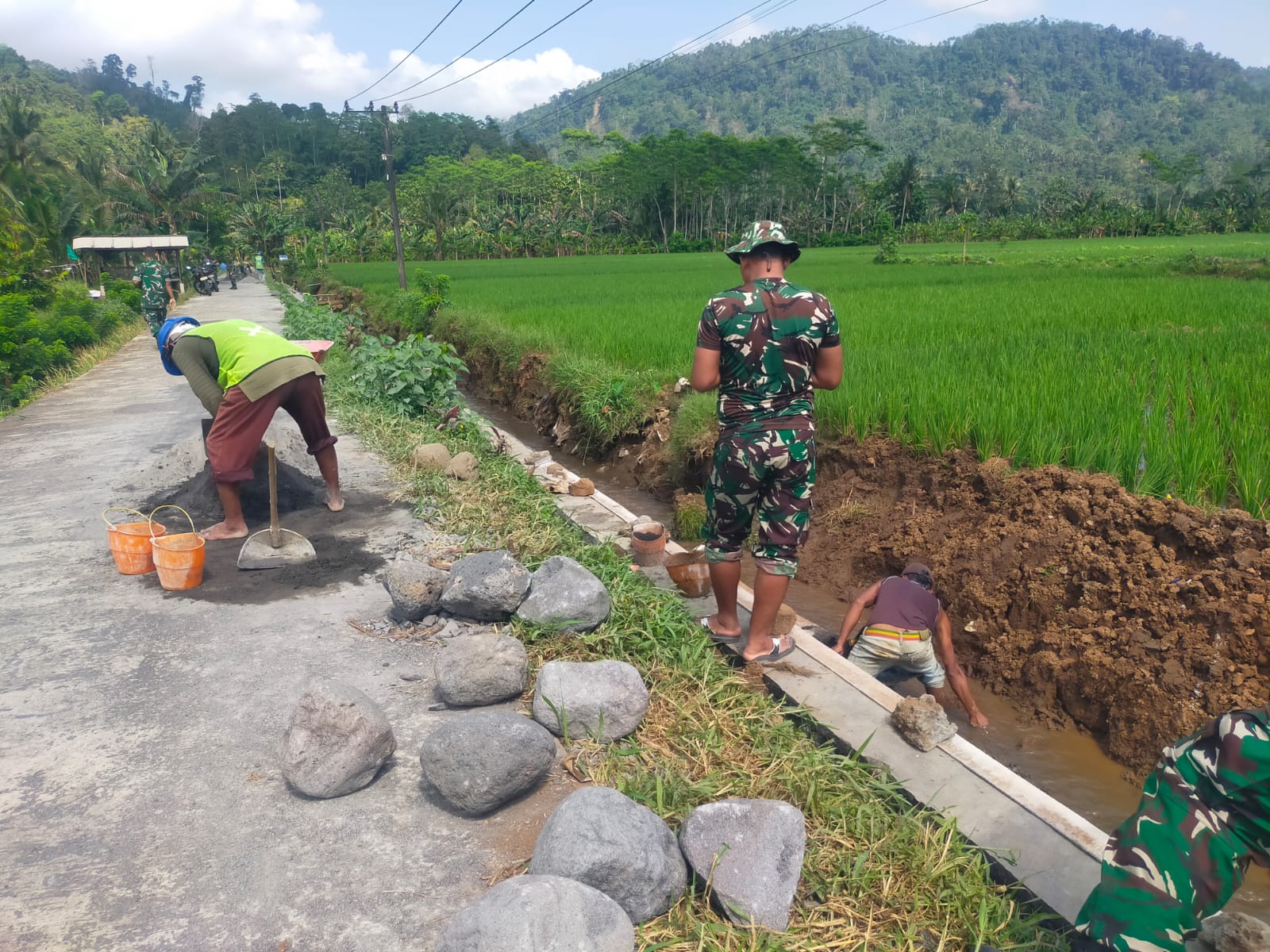 Antusiasme masyarakat terlihat jelas dari keterlibatan mereka dalam proses pembangunan, mulai dari penggalian tanah hingga pemasangan batu. Kebersamaan antara personel TNI dan warga menjadi cerminan semangat solidaritas dan kepedulian terhadap kemajuan desa.