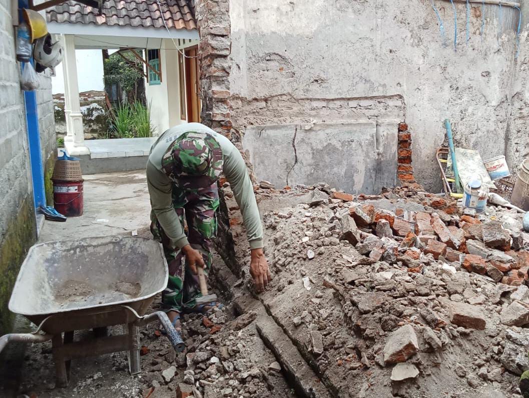 LCN -:Pasuruan, – Ditengah reruntuhan dinding tua dan tumpukan puing bata merah, seorang prajurit TNI dengan seragam loreng khas terlihat tekun menghancurkan sisa-sisa lantai lama menggunakan palu besar. Suara ketukan palu bercampur debu beterbangan menggambarkan semangat gotong royong yang tengah berlangsung disebuah halaman rumah sederhana di Dusun Desa Wonosari, Kecamatan Gondangwetan, Kabupaten Pasuruan, Jum’at (27/02/2026).