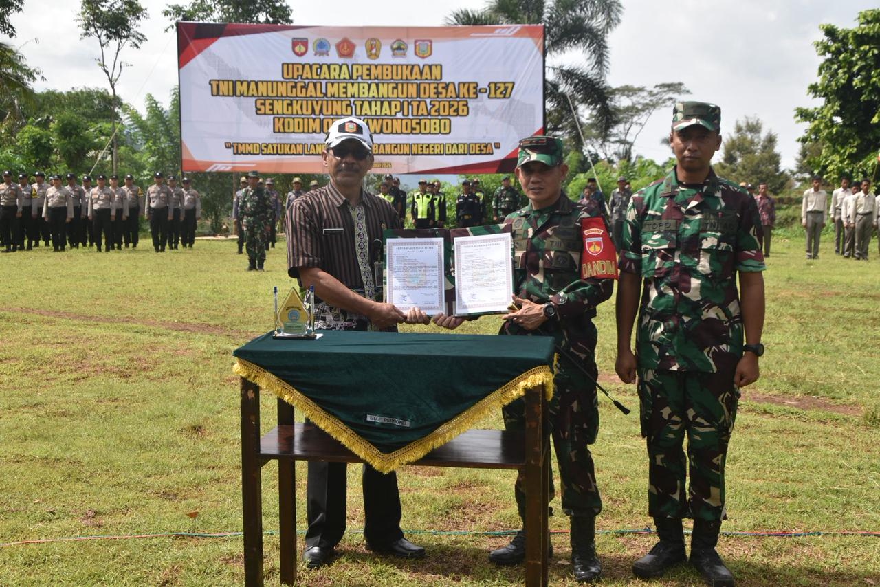 TMMD Sengkuyung Tahap I tahun ini mengusung tema “TMMD Satukan Langkah, Membangun Negeri dari Desa” dan akan berlangsung hingga 11 Maret 2026. Program tersebut menjadi penegasan komitmen bersama bahwa kemajuan daerah harus dimulai dari desa yang kuat, mandiri, dan mampu mengelola potensi wilayahnya secara berkelanjutan.