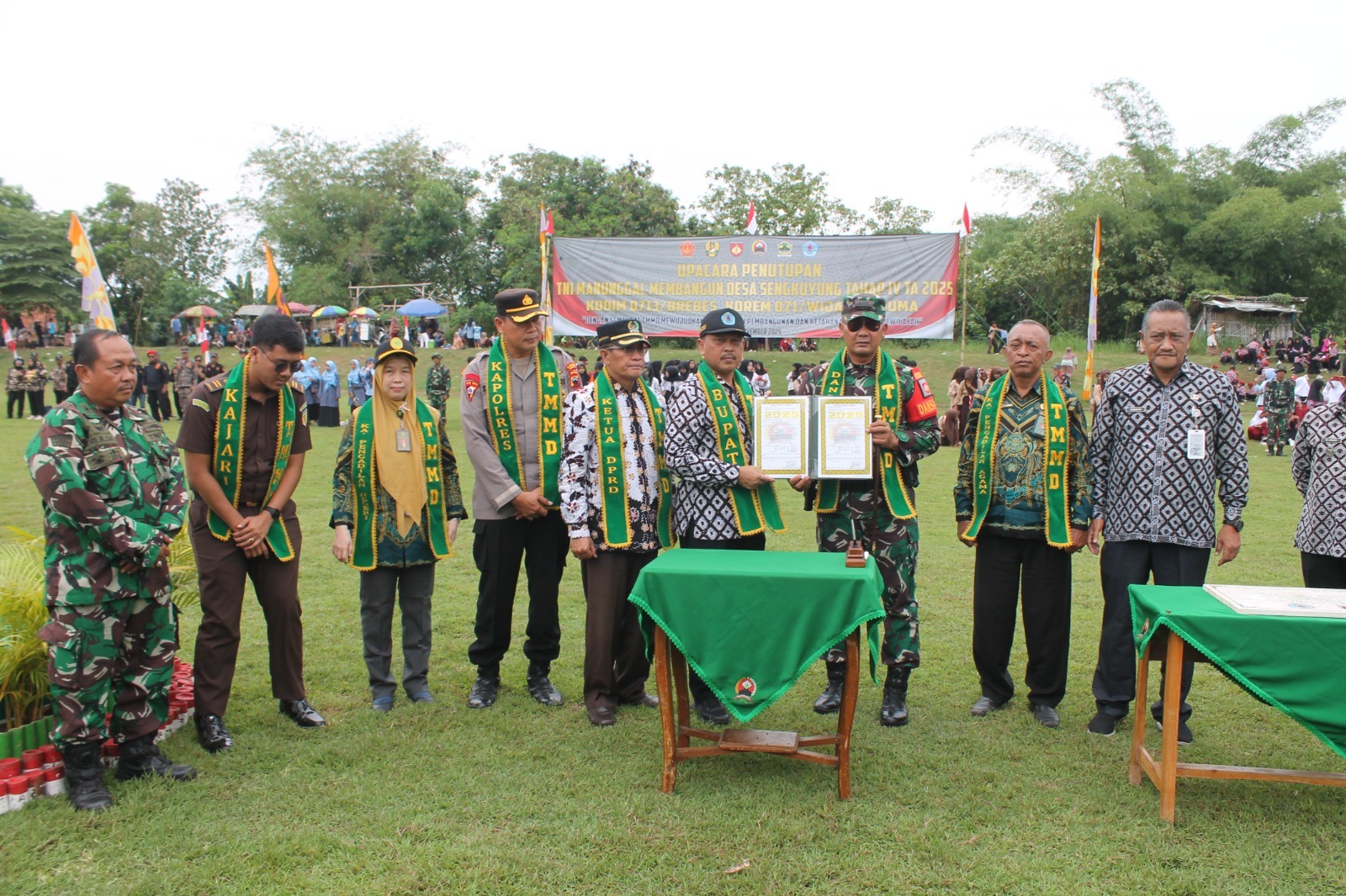 Timcyber—Brebes – Kodim 0713 Brebes, Korem 071 Wijayakusuma menggelar Upacara penutupan TNI Manunggal Membangun Desa (TMMD) Sengkuyung tahap IV tahun anggaran 2025 di halaman Lapangan Bola Desa Kalibuntu, Kecamatan Losari, Brebes, Jawa Tengah. Kamis (6/11/2025). TMMD ditutup secara simbolis dengan penyerahan kembali alat kerja seperti cangkul dan sekop dari personel TNI kepada Dandim.
