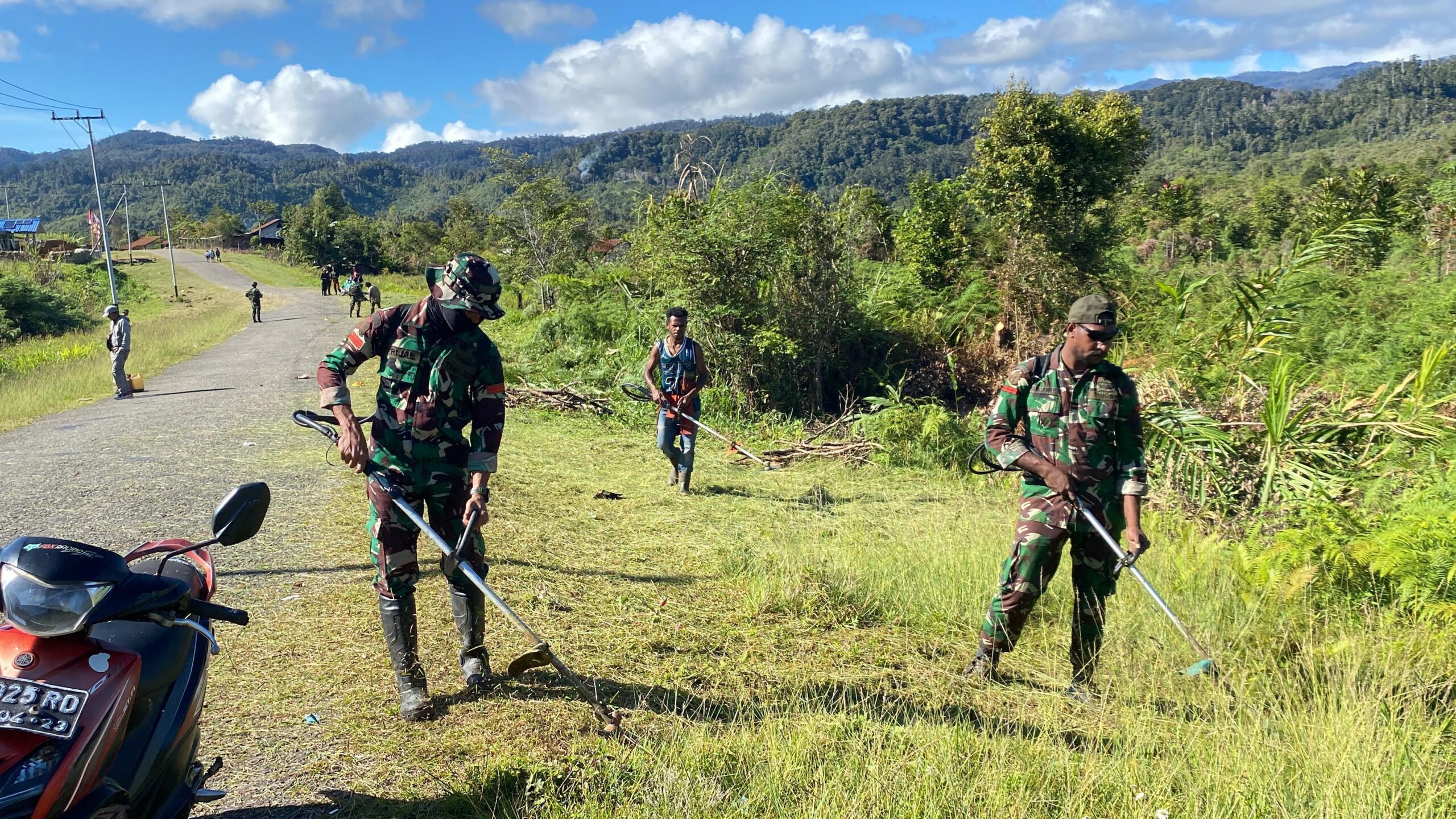 Puluhan prajurit bersama masyarakat setempat bahu-membahu membersihkan jalan utama kampung yang menjadi jalur vital aktivitas warga. Gotong royong ini dilakukan untuk menciptakan lingkungan bersih, aman, dan mendukung kelancaran aktivitas masyarakat sehari-hari, sekaligus mempererat hubungan emosional antara TNI dan warga.