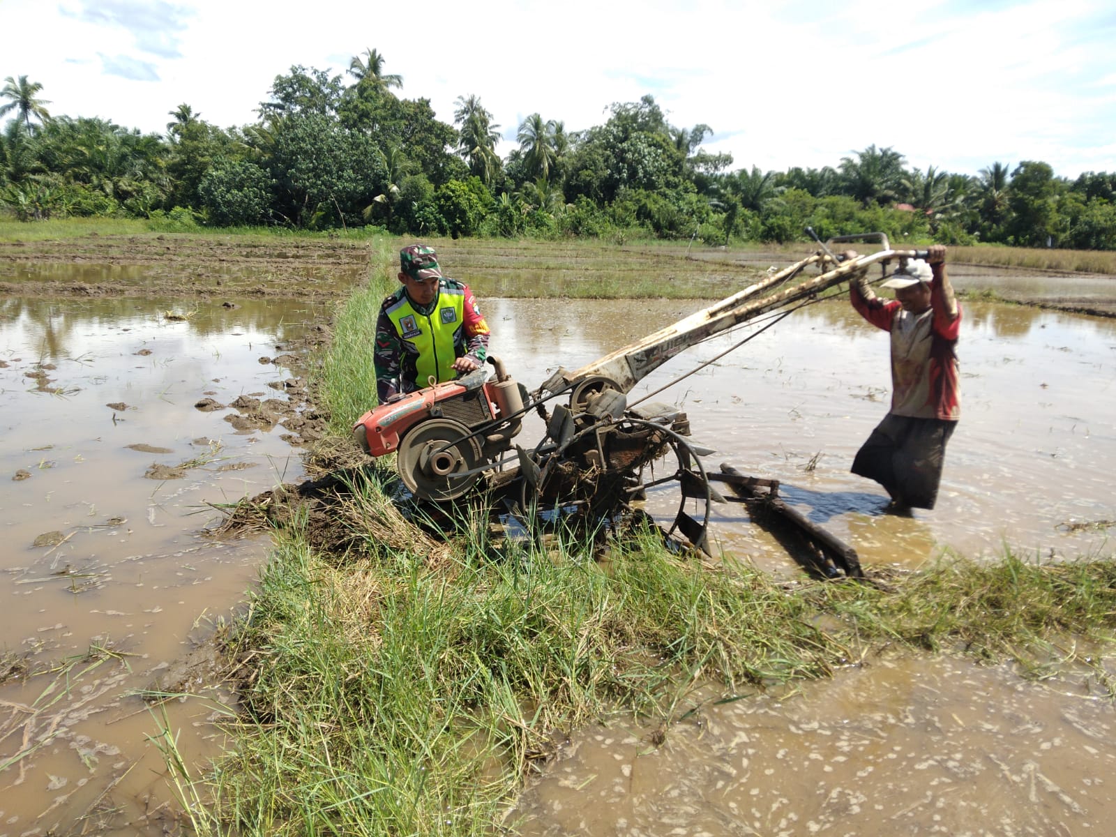 Dibawah terik matahari dan ditengah mengumpulkan air berlumpur, Kopda Hendrawan bersama Pak Safrijal mengoperasikan mesin bajak sawah untuk mengolah tanah sebagai persiapan masa tanam padi. Aktivitas ini bukan sekedar rutinitas pertanian, namun menjadi simbol kuatnya kebersamaan antara TNI dan rakyat dalam membangun ketahanan pangan dari akar rumput.