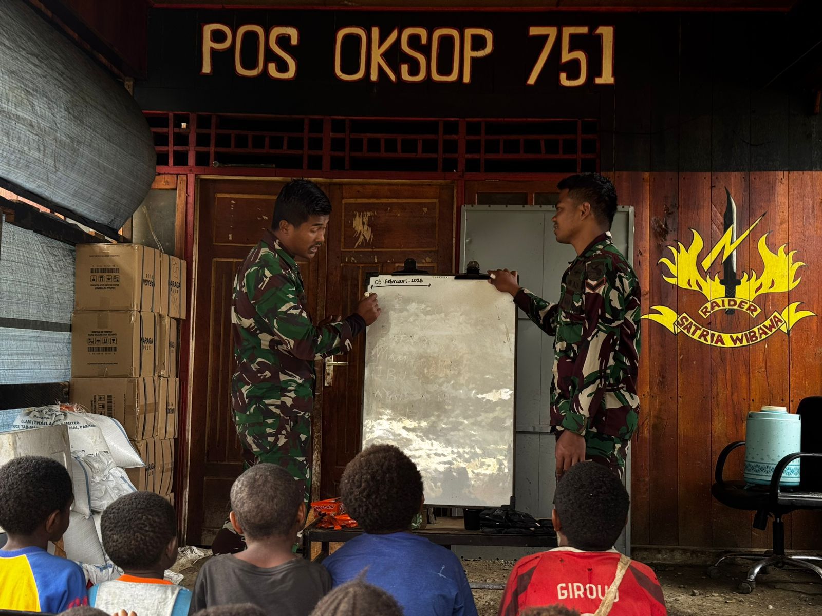 LCN – Oksop, – Pegunungan Bintang Pos Oksop Yonif 751/Vira Jaya Sakti (VJS) Satgas Swasembada melaksanakan kegiatan belajar calistung (membaca, menulis, dan berhitung) bagi anak-anak perbatasan dipos. Kegiatan ini menjadi bagian dari pembinaan teritorial yang edukatif sebagai upaya mencerdaskan anak bangsa, sehingga kelak mereka memiliki masa depan yang lebih cerah dan siap menjadi generasi penerus bangsa. Minggu, (22/02/2026).