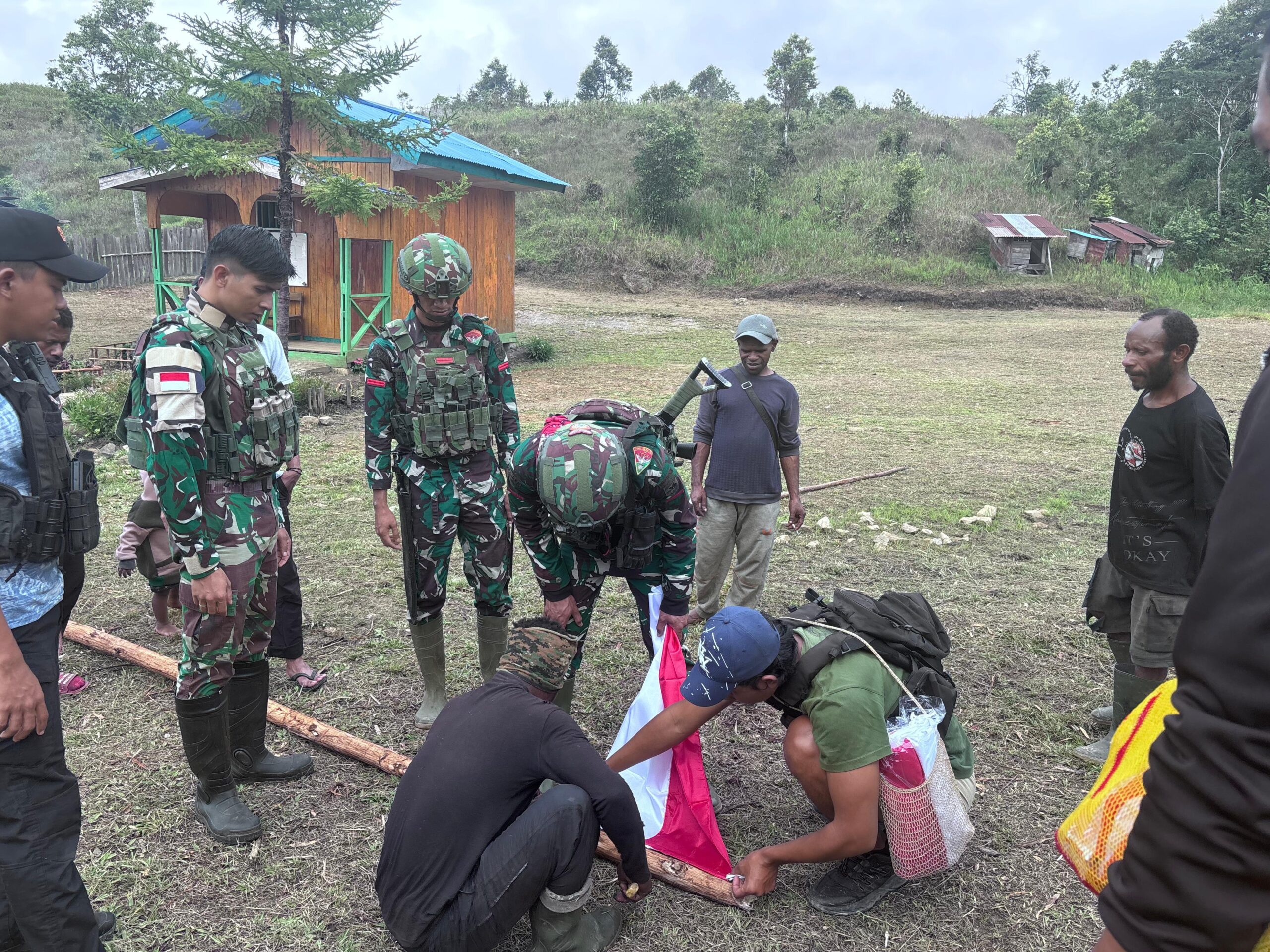 LCN – Serambakon – Pegunungan Bintang, Papua. Dalam upaya menumbuhkan semangat nasionalisme serta menjaga kebersihan lingkungan, Pos Serambakon Satgas Pamtas RI–PNG Yonif 751/Vira Jaya Sakti (VJS) melaksanakan kegiatan pemasangan bendera Merah Putih dan kerja bakti bersama masyarakat di Kampung Wanbakon, Distrik Serambakon, Kabupaten Pegunungan Bintang, Sabtu (06/09/2025).